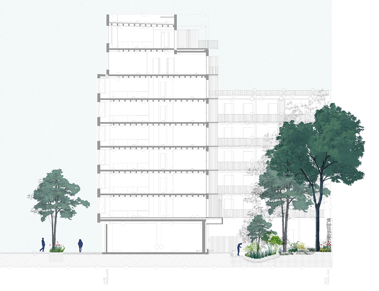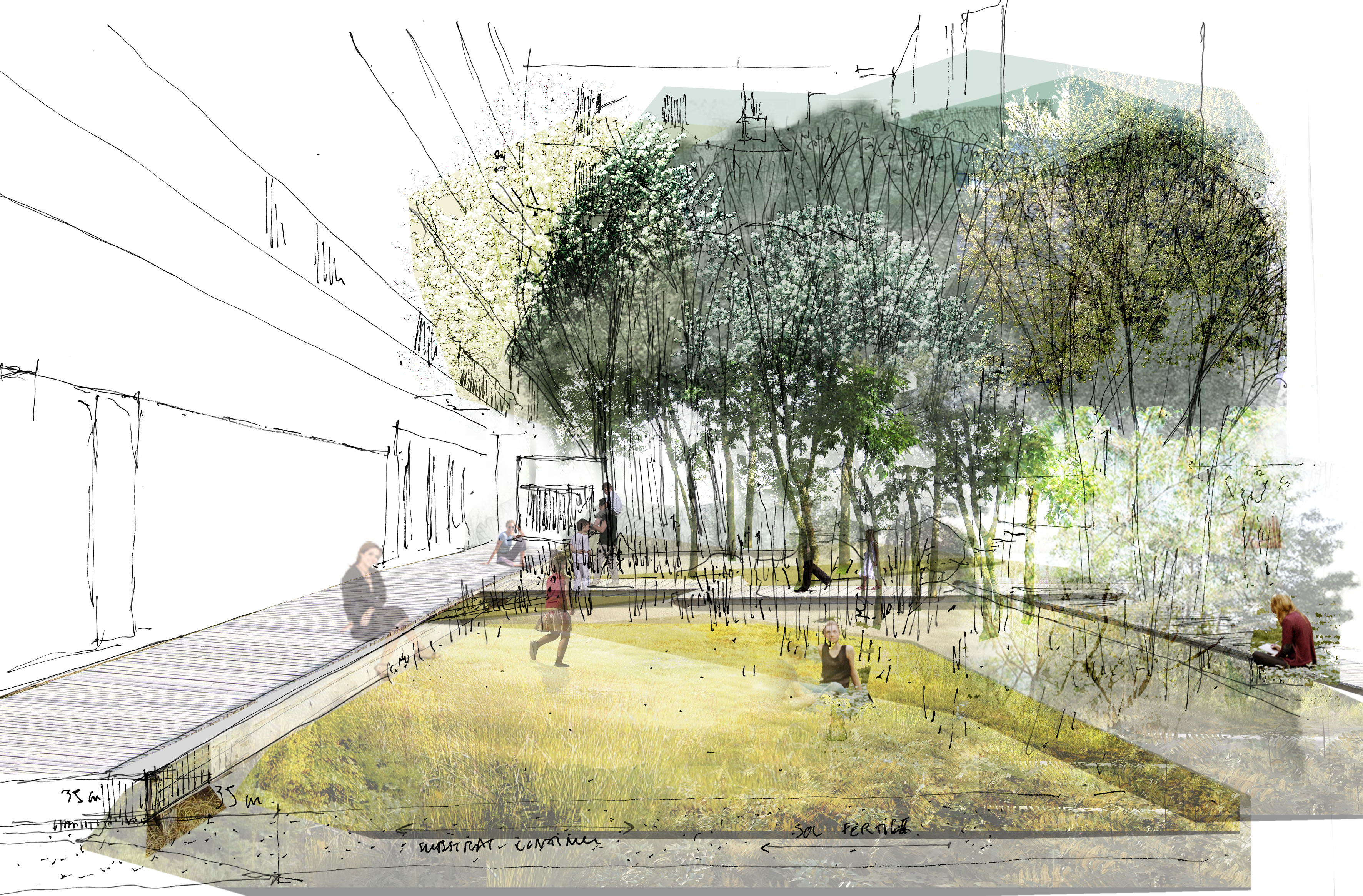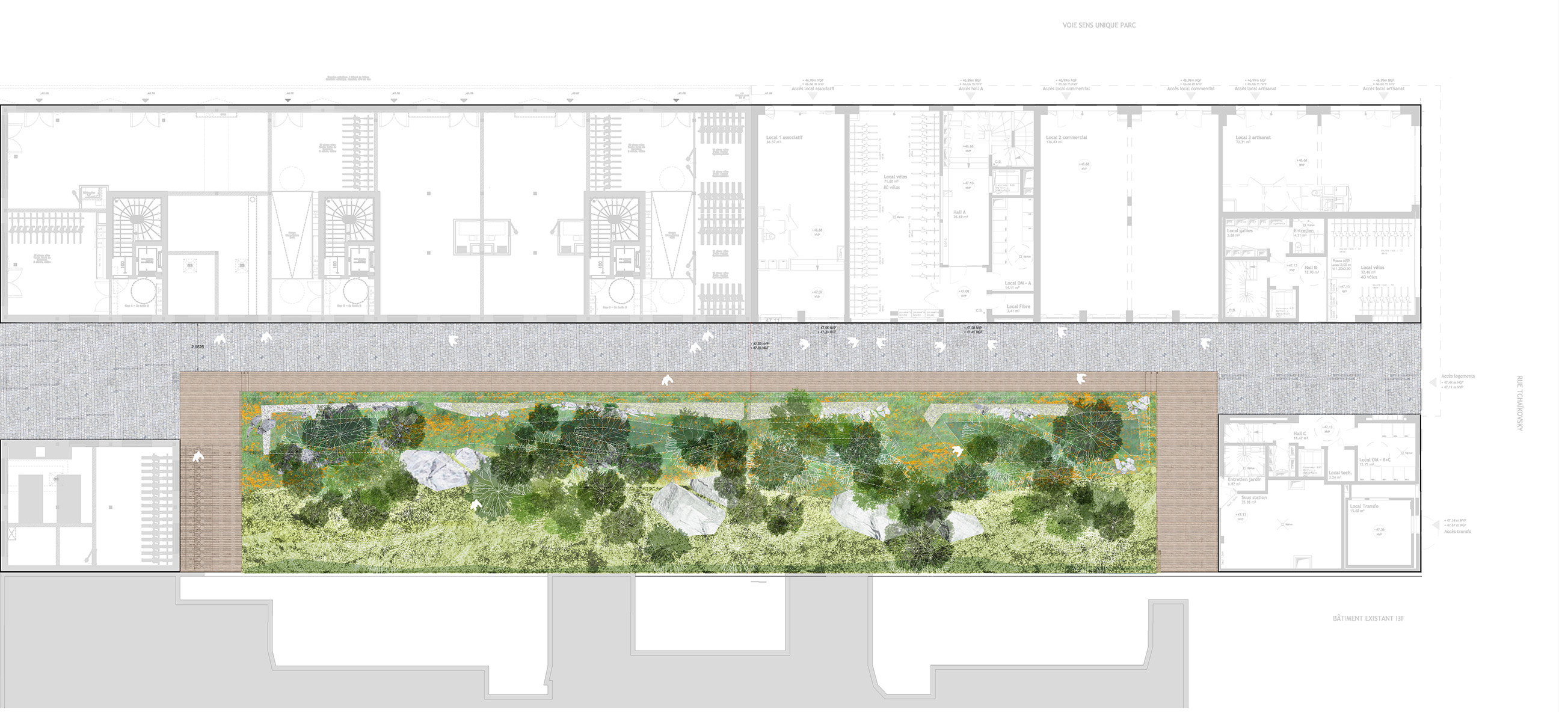Le jardin s’intègre dans l’épaisseur de la rive du Parc Chapelle Charbon. Nous considérons ces 1000 m2 comme une surface disponible pour inventer un jardin fantastique, une figure forte et des dispositifs écologiques originaux qui s’invitent sur toutes les strates du bâtiment.