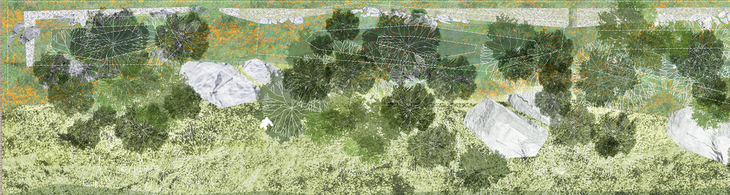 . Des scènes végétales travaillées comme des micro-géographies : enrochements, rétention des eaux, gravillons et galets.