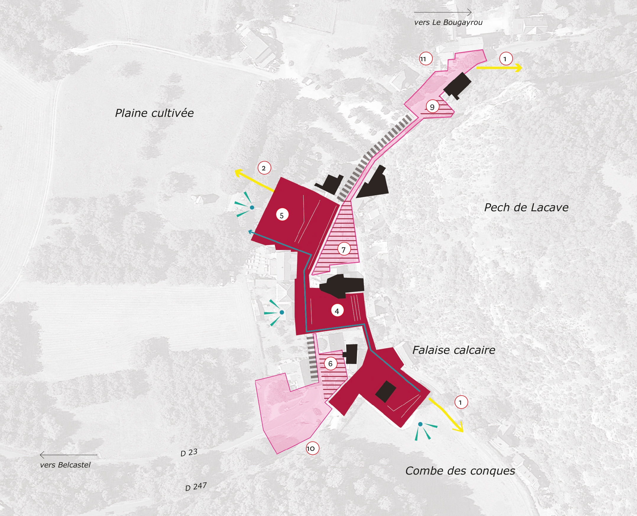 Par l’intermédiaire d’arpentages collectifs, d’ateliers de travail collaboratifs, l'équipe de maitrise d’œuvre et les acteurs locaux retrouvent la figure originelle et locale de la commune. Cette figure s’appuie sur les tracés topographiques existants, qui constituent la singularité de Lacave. S'appuyer sur 3 terrasses géologiques :