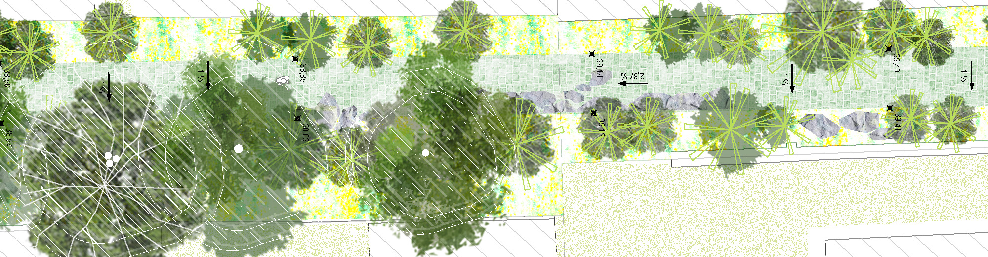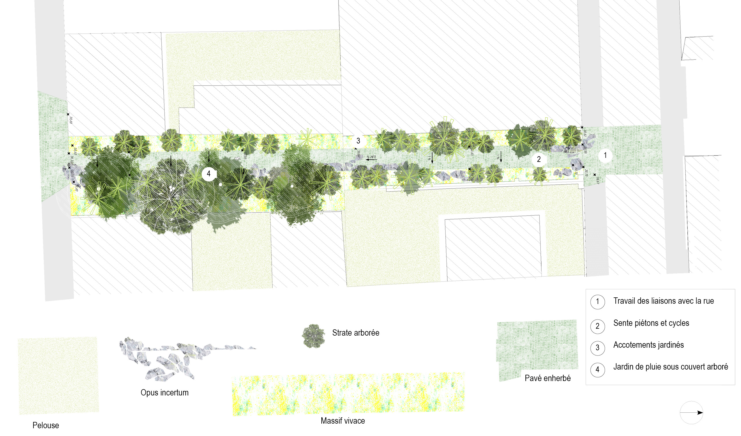 Plan masse - une venelle écologique : multiplier les strates végétales pour séquencer les parcours et travailler finement les limites séparatives
